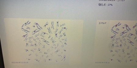 仮想カップにいれたエメラルドの原石の周波数がその対象部位にとって合っていると強化、合ってないと弱化と表示されます。