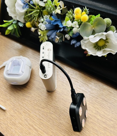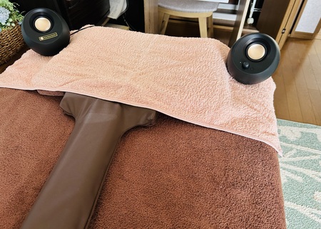 イヤホンではニュースキャンのヘッドフォンができないので、写真のように“熟睡スピーカー”を頭の左右に置いてお試ししたいただきます。