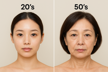 50代:構造的変化と皮膚の変化が同時に進む。たるみが一気に顕著に。二重アゴが固定化、首~フェイスラインの境界が曖昧に、ほうれい線、マリオネットラインが固定化する。