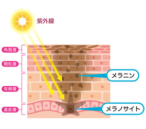 1.紫外線によってメラノサイト(色素形成細胞)に「肌を黒くして肌を守りなさい!」という指令がでる