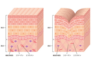 ↑この図でいうと(右)のたるんでゆるんでキメの粗くなったお肌を(左)のきれいに整ったピンとハリのあるお肌に戻すことができるのです。
