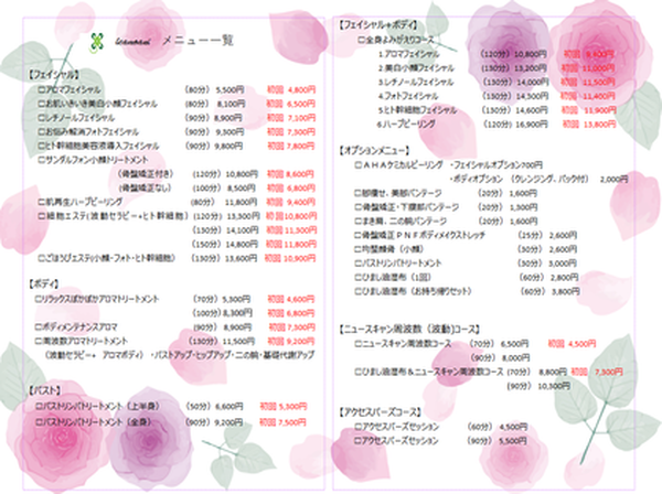 メニュー一覧 こちらに各メニューの金額、詳細をアップしました。
